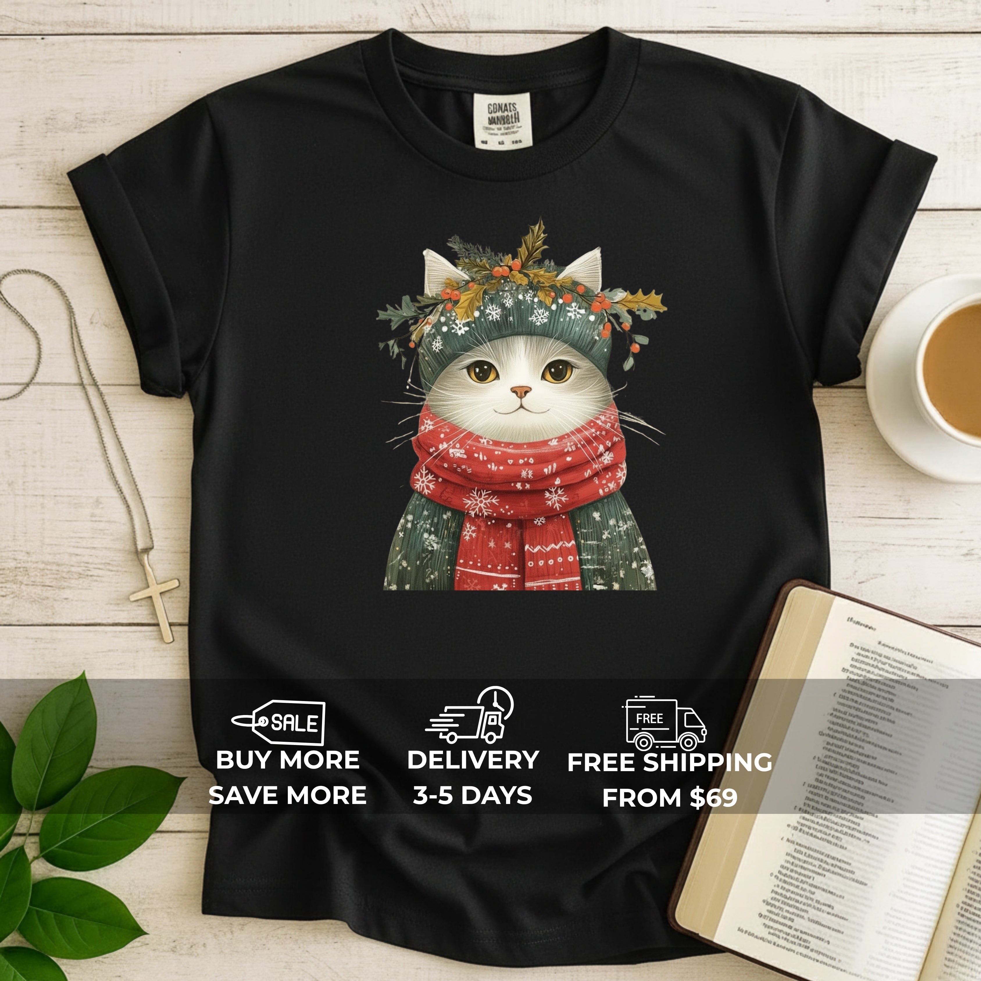 Comfort Colors Festive Cat Christmas T-Shirt