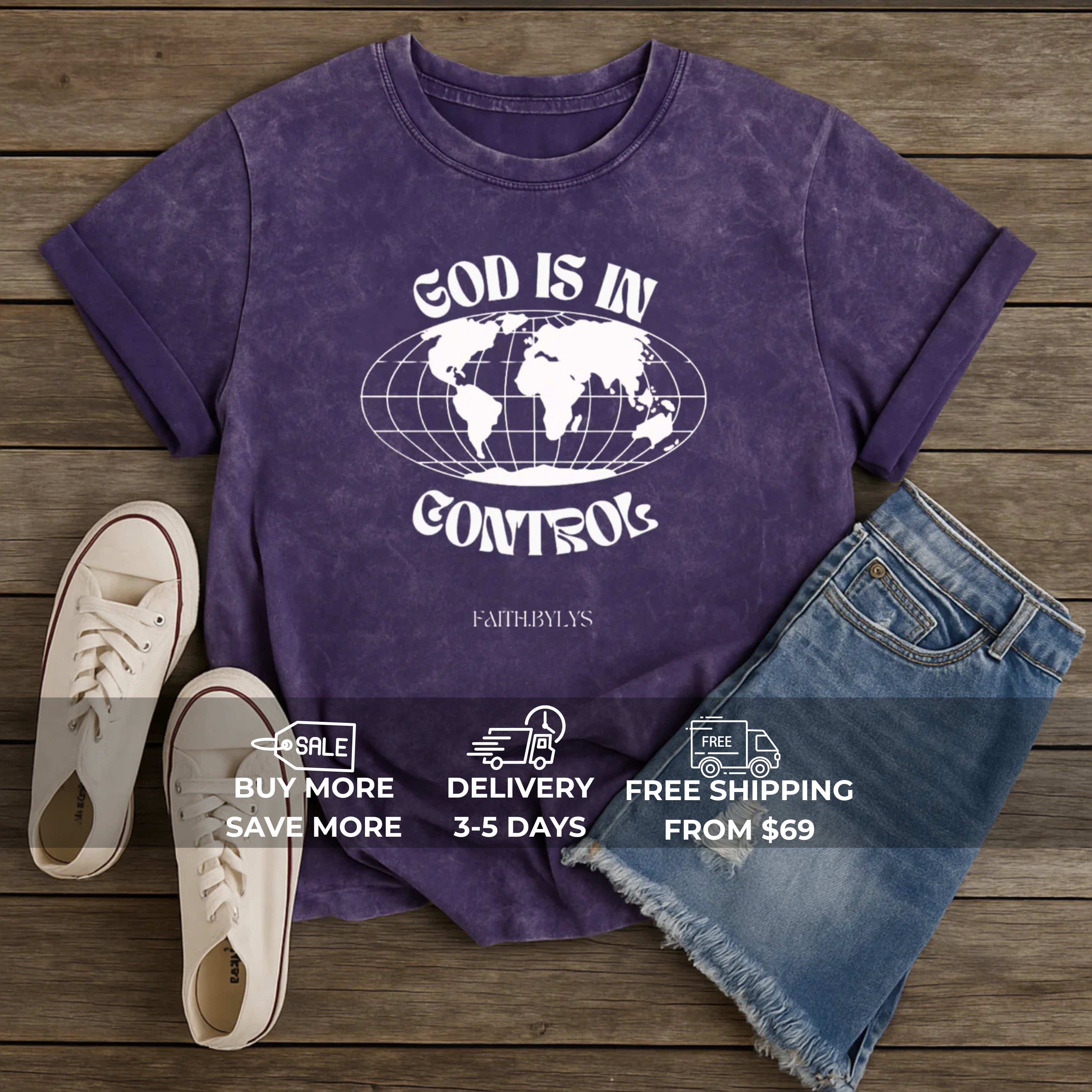 Front print: Globe graphic + “God Is in Control” Bible verse